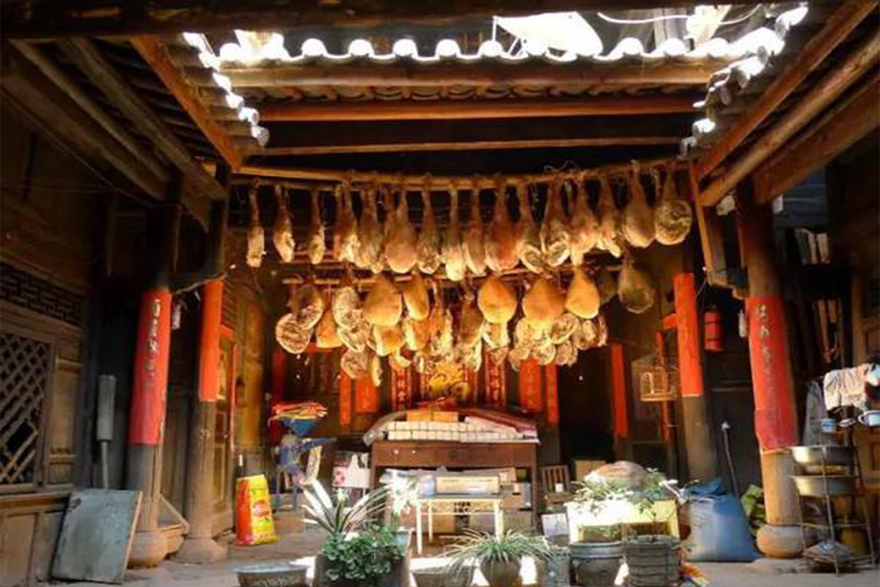 白族诺邓火腿的配料独特,切口肉色嫩红,具有浓郁的乡土风味和白族同胞腌腊制品的风格。每年隆冬腊月之际,白族同胞纷纷宰杀肥猪,制作火腿,称之为“正冬腿”。 诺邓出产的食盐极佳,它是采用传统的工艺加工精制的并用铁锅熬成大块状,当地人称为“锅底盐”,用它腌制肉食格外馨香!还有一个主要原因是那里的雨量适中,气候温和,霜期较为短,养猪多以玉米、大豆及绿叶植物为饲料,为腌制优良的猪膘肉创造了最佳条件。